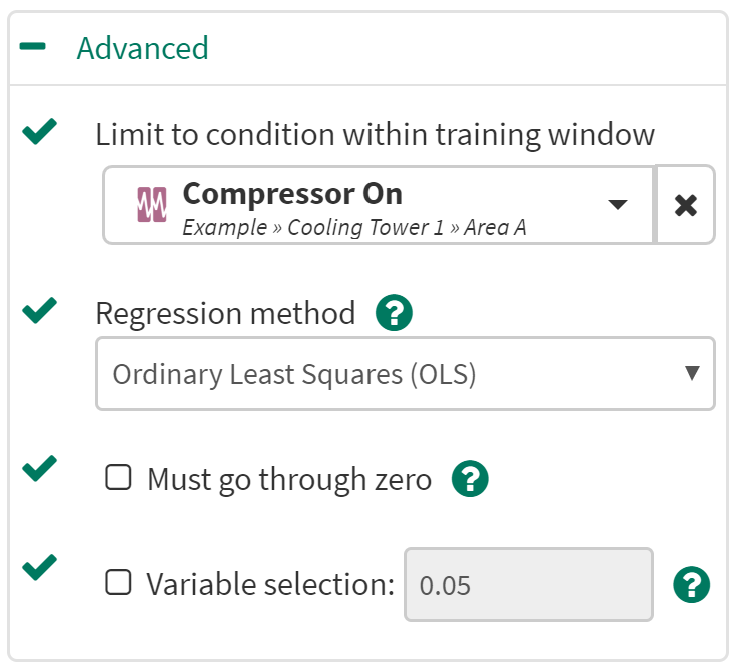 Limit to condition within training window: You can choose to limit the regression only to the data from within the training window and within a condition. For example, choose a condition that identifies when an operation is running and all data outside of the condition (when the unit is not running) will be ignored for the regression analysis.