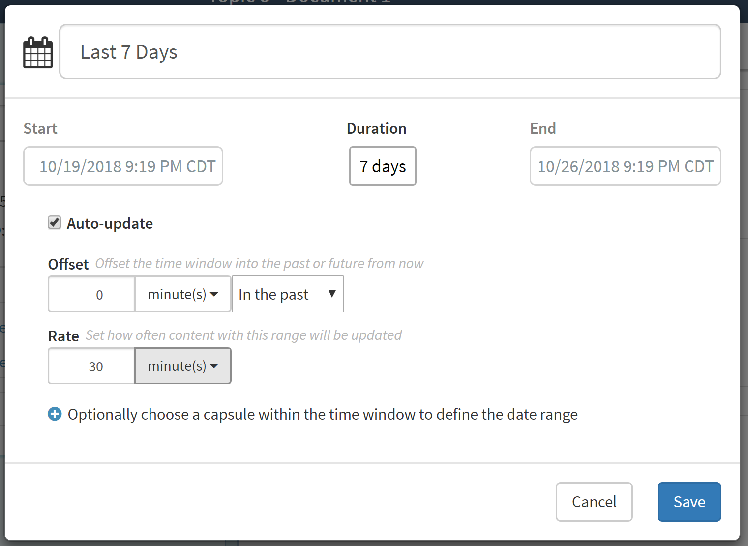 (Optional) Offset - define the difference to display if you would like to offset the time window into the past or future.