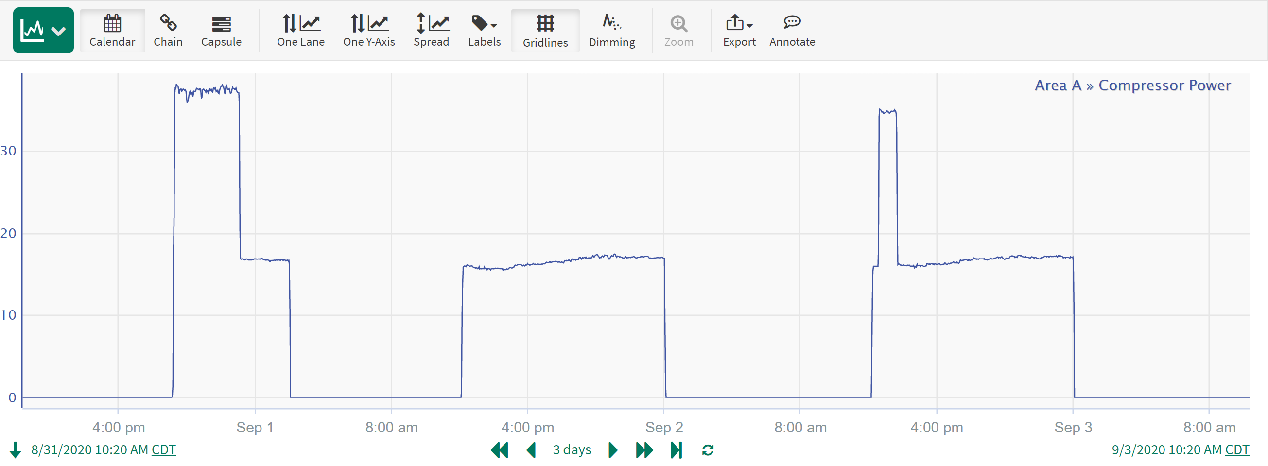 This button condenses the selected signal trends into a single lane. Signals maintain minimum and maximum axis bounds.