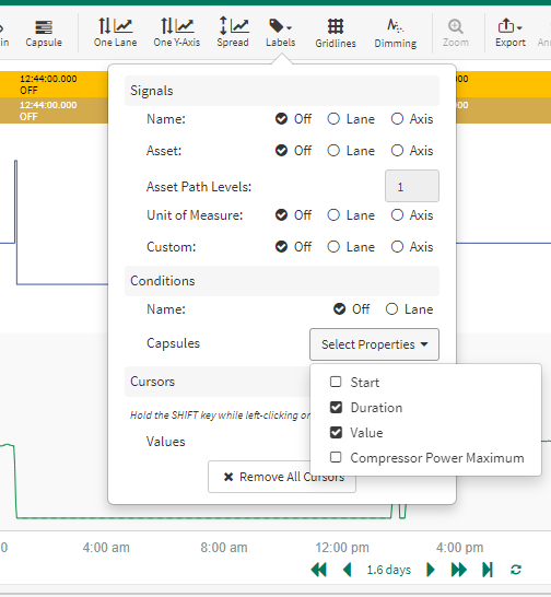 Cursor labels can also be modified in this panel to hide the values or remove all of them. Cursors are placed on the trends by holding Shift+Left-Click or a Right-Click. Individual cursors can be deleted by clicking the cursor flag and then the small X that appears. If you select a region on the trend, you can use the labels menu to delete all cursors within that selected region.