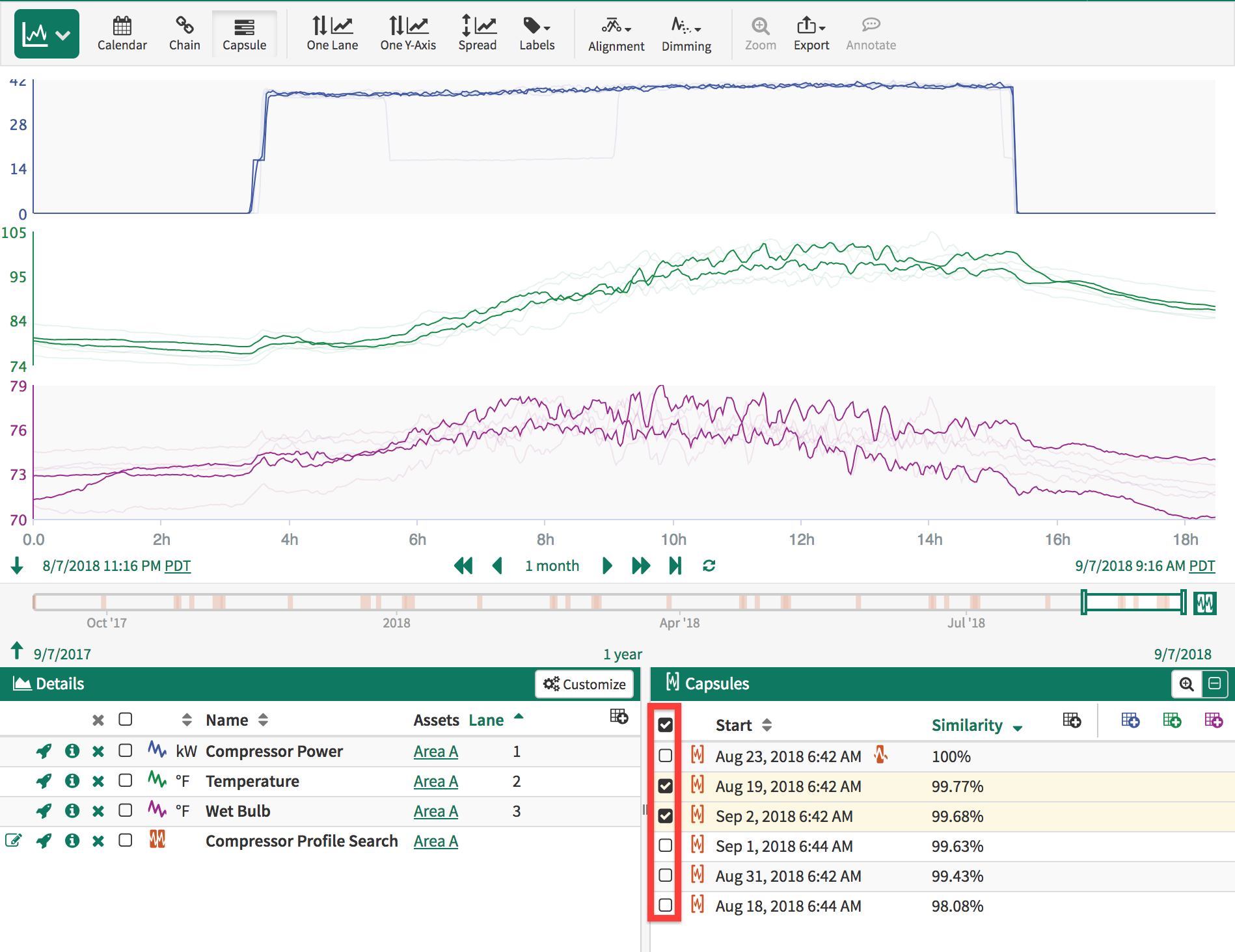 All of the capsules are visible on the trend by default. You can use the checkboxes next to each capsule in the Capsules Pane to highlight certain capsules. The capsules pertaining to the checked boxes will appear on the trend normally. The capsules pertaining to the unchecked boxes will appear "dimmed" on the trend.