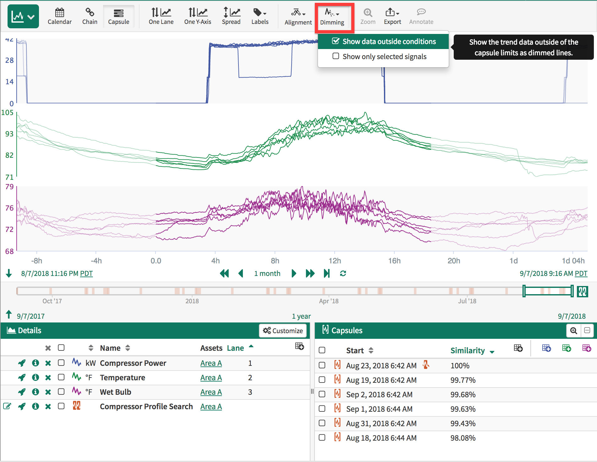While your signals are aligned in relative time, you can view what is occurring before and after each of the capsules end using the Show data outside conditions option from the Dimming Menu. In Capsule Time you can still pan/zoom the trend just as you would in the standard view - Adjusting Time Ranges