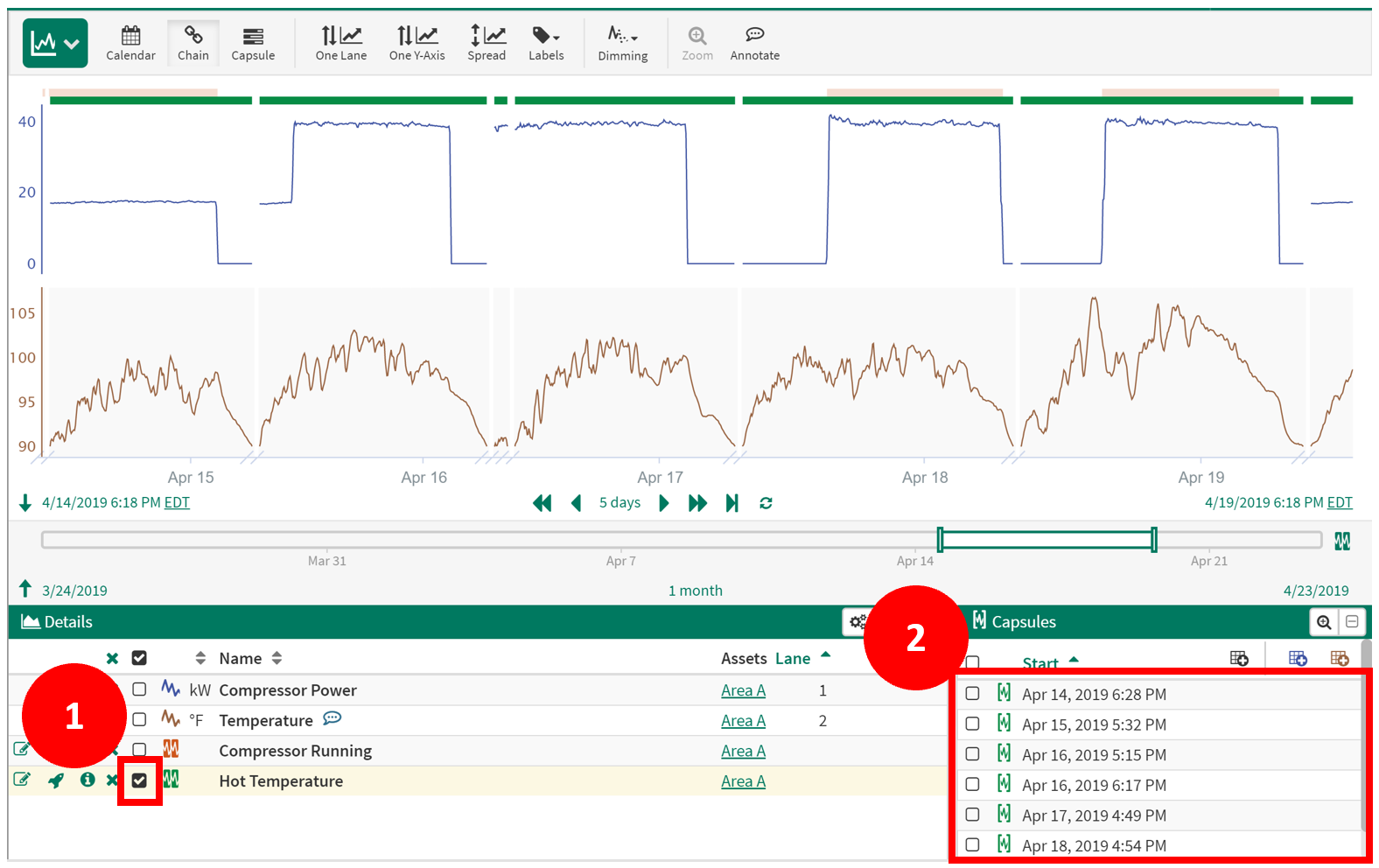 By selecting a condition in the details pane (check the box next to the item as shown in step 1 of the screenshot to the right), the capsules pane is filtered to just show capsules from the Hot Temperature condition (step 2). This filter also applies to the chain view plotting and now the trend only shows times when it is Hot Temperature.