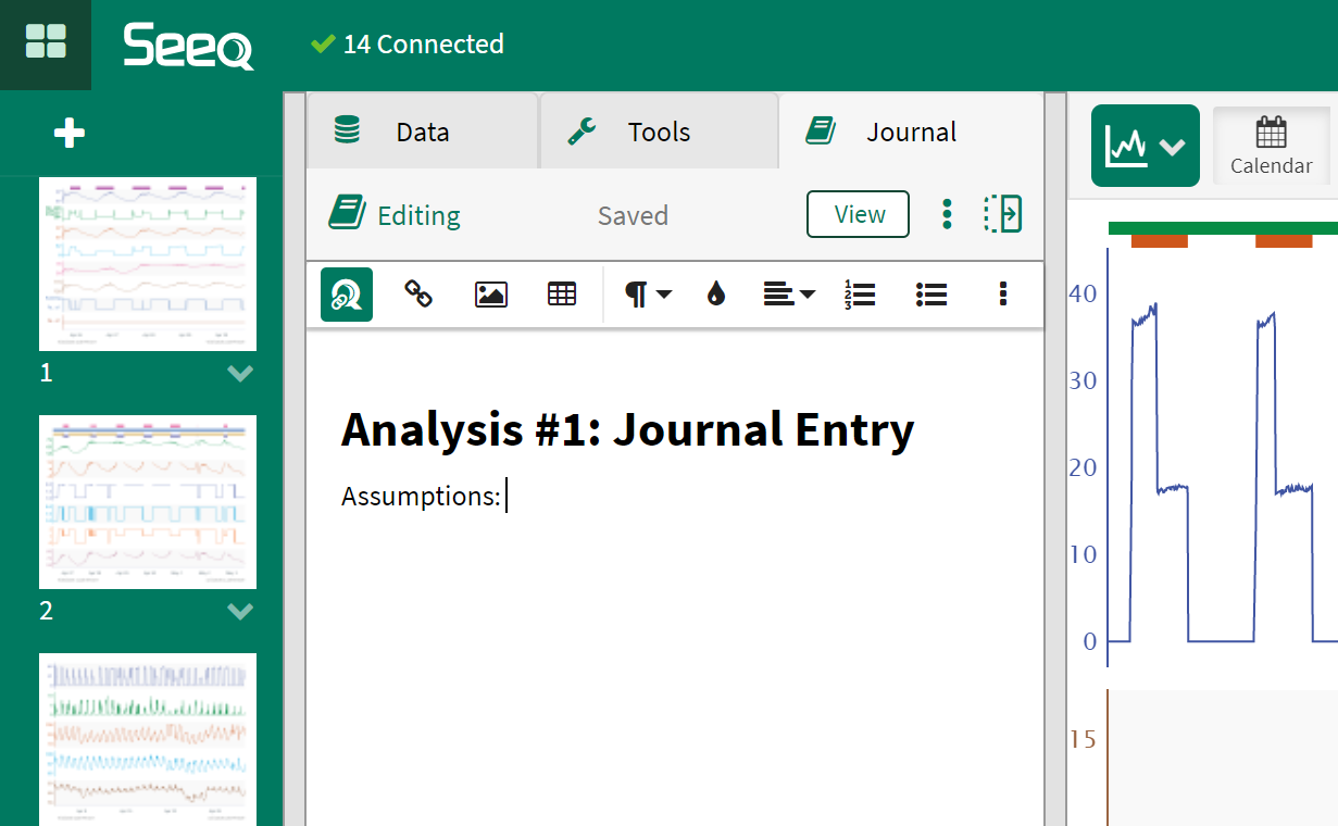 Journal entries are free-form text that accompanies a worksheet. You can document your analysis as you go by explaining key assumptions and saving critical views in the Worksheet Journal. Best practices are to create a single journal entry per Worksheet.