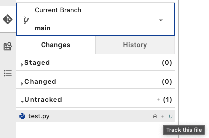 Navigate to the Git icon in the leftmost toolbar (:git:). Under: Changes → Untracked, you should see the file that was added. When hovering over the file, to the right of the file, click ‘+' to stage or 'Track this file’.