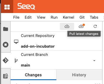 If its been awhile, and you want to update your Git repository in Data Lab, navigate to the git sidebar tab (:git:), and click the cloud with an arrow pointing down (:cloud-down: ) to “Pull latest changes” from the remote GitHub repository.
