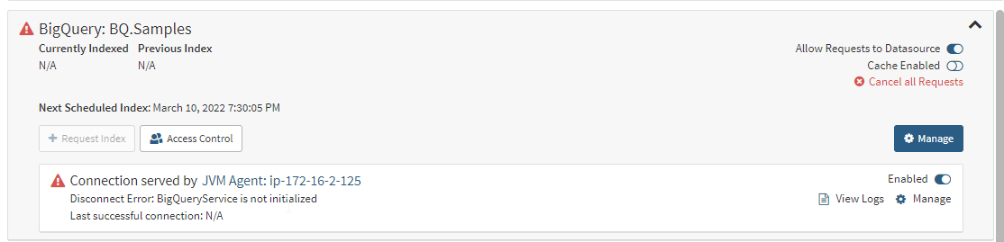 When the BigQuery connector is unable to connect to Google, the logs will contain entries that look like: