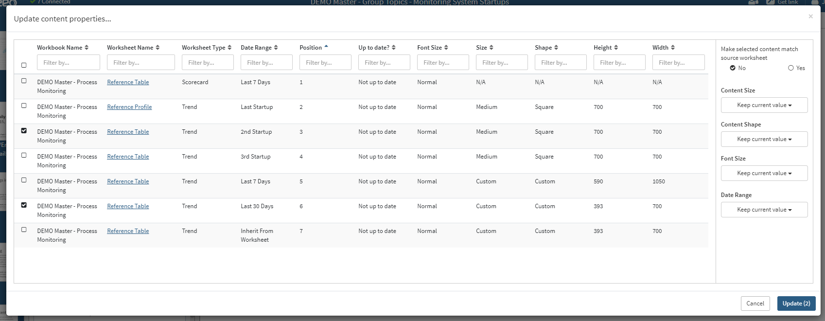 You can click on the Seeq Content count in a topic's left panel to make updates to more than one piece of content at a time. Selecting this will display a table with the details for each piece of content (the properties you would normally see in the single content modal). Sort and filter the table as needed to select individual rows of the table, and apply a single update to many pieces of content at once. Additionally, you may highlight a selection of the topic before clicking the link, and any content in that highlight will be already be selected upon opening the modal.