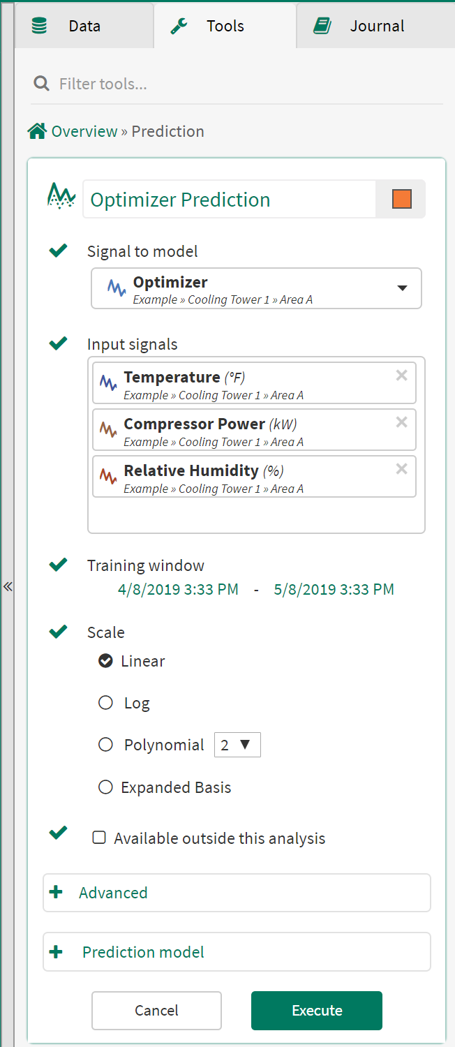 Prediction enables users to predict a signal based on other correlated signals with linear and non-linear regression models.