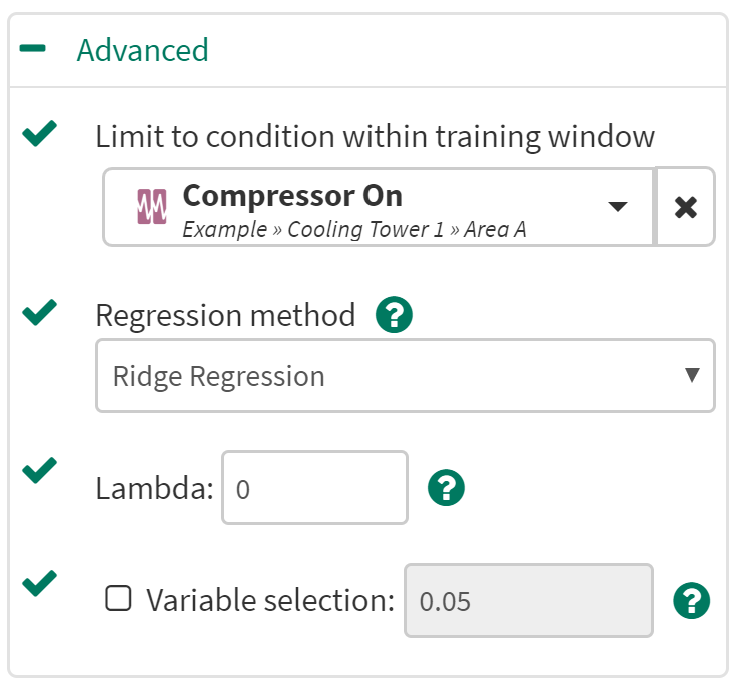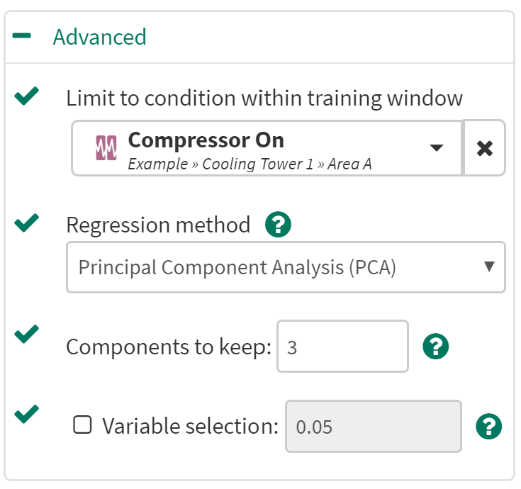 Limit to condition within training window: You can choose to limit the regression only to the data from within the training window and within a condition. For example, choose a condition that identifies when an operation is running and all data outside of the condition (when the unit is not running) will be ignored for the regression analysis.