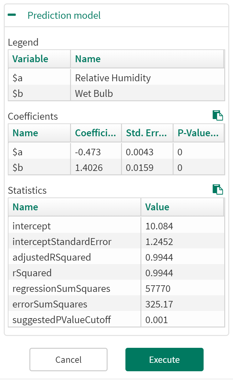 Prediction Model: You can view the Legend, Coefficients and Statistics for the resulting prediction model. You can also change the model type in "Options" and observe how the prediction model results change within the tool. Any single input Predictions can be displayed on a XY Plot.