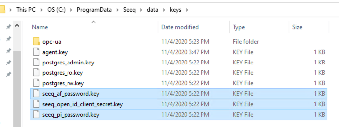 It is recommended to keep all the secrets in a folder in your DATA_DIR. A good location would be the DATA_DIR\\keys folder or a subfolder of it. For example, on Windows the secrets files may be placed in a keys directory as shown: