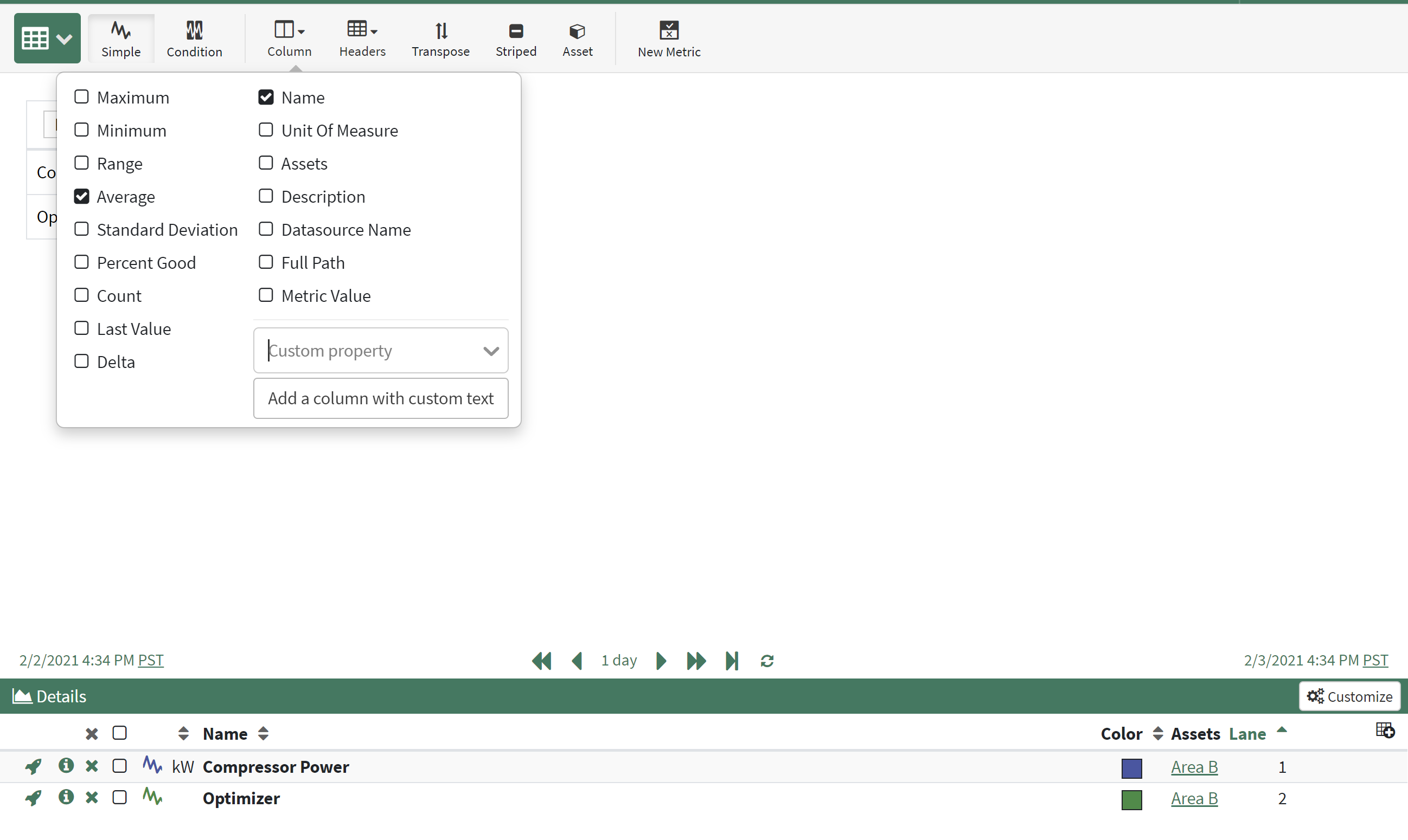 Select Condition or Continuous Metrics to display in the Details Pane. Adjust column header formatting with Header button in Toolbar.