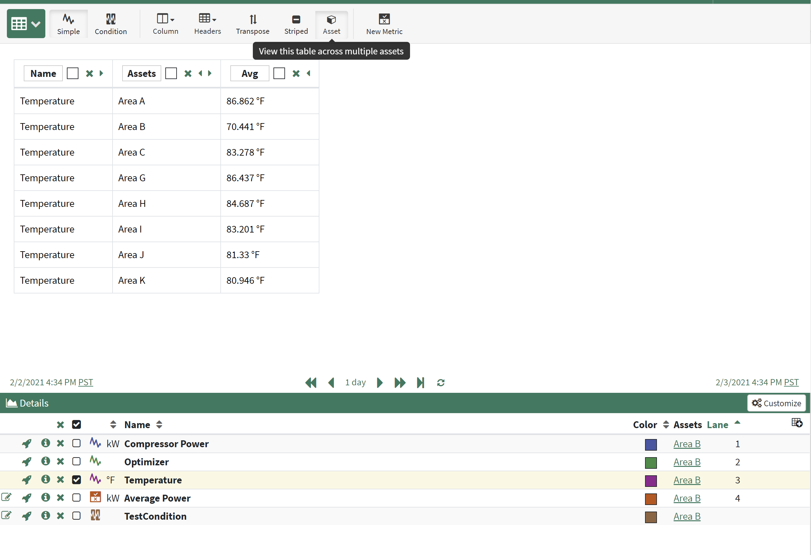 If there is at least one calculation/item shown in your table that is based on an asset, use the Asset button in the Toolbar to select a parent asset to reflect the results in the table. Selecting a parent will display a table across the immediate children assets (only a single layer of the tree at a time). In the table to the left, Example >> Cooling Tower 1 is selected to see Average Temperature results across all Areas below Cooling Tower 1.