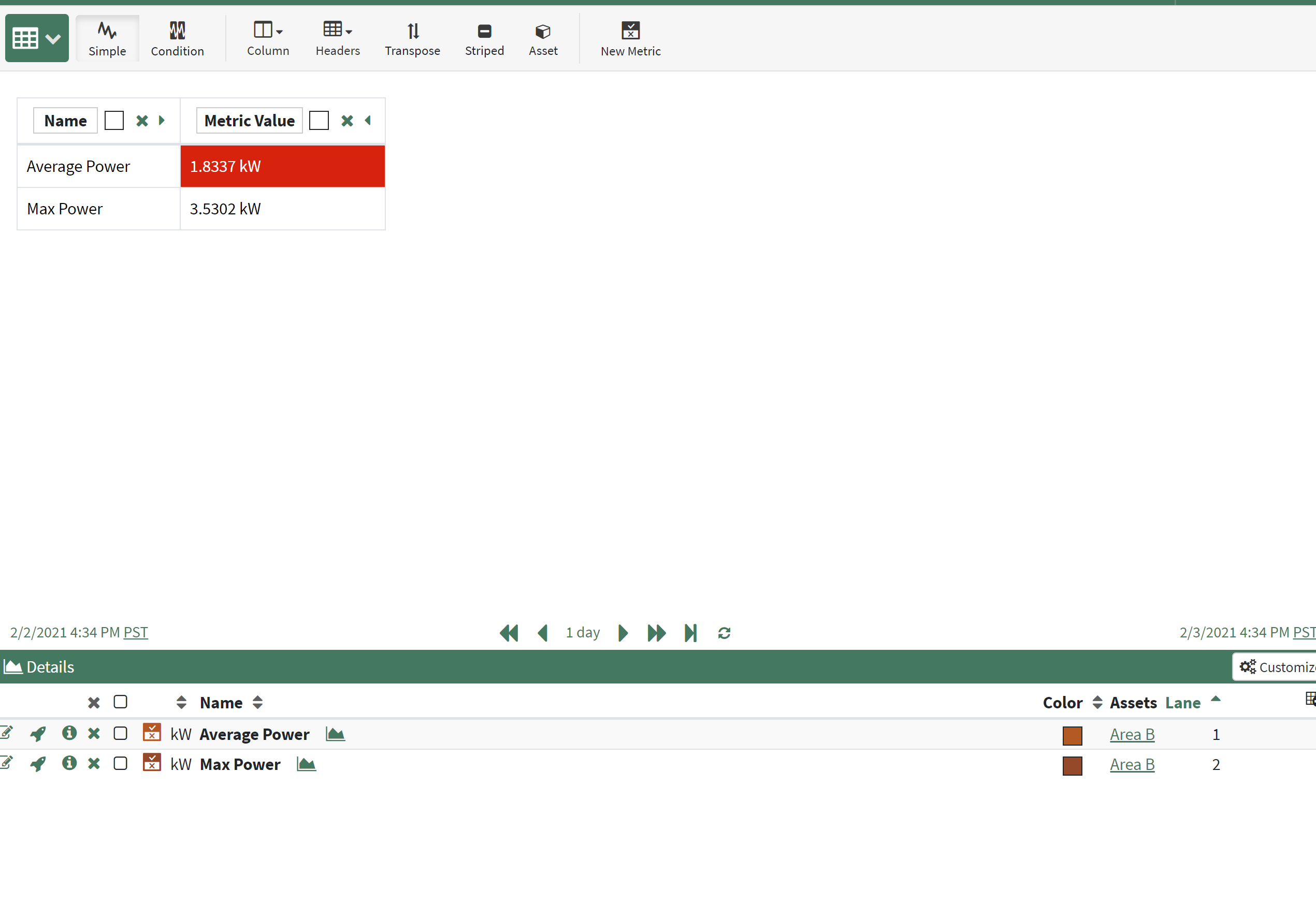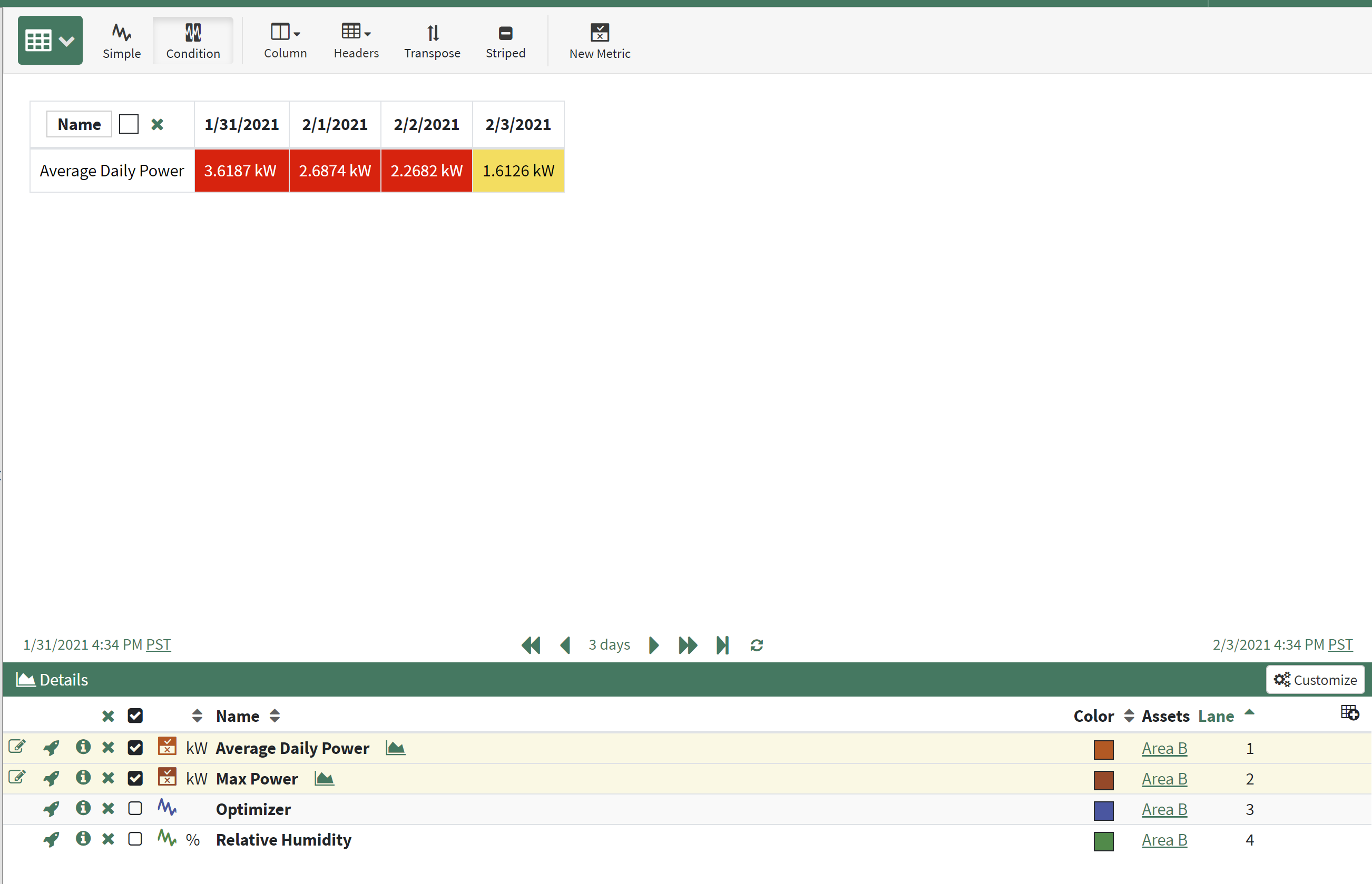 Use the Condition Table to display Condition and Continuous Metrics. Simple Metrics will not display in Condition Table. Conditions can also display here without Metrics, but Metrics will be needed to color cells relative to values against thresholds or to click on the value and see the underlying metric in Trend View.