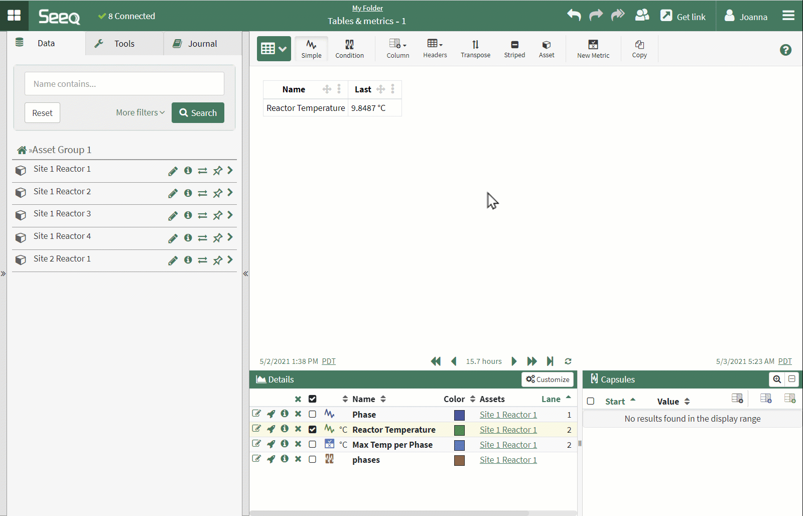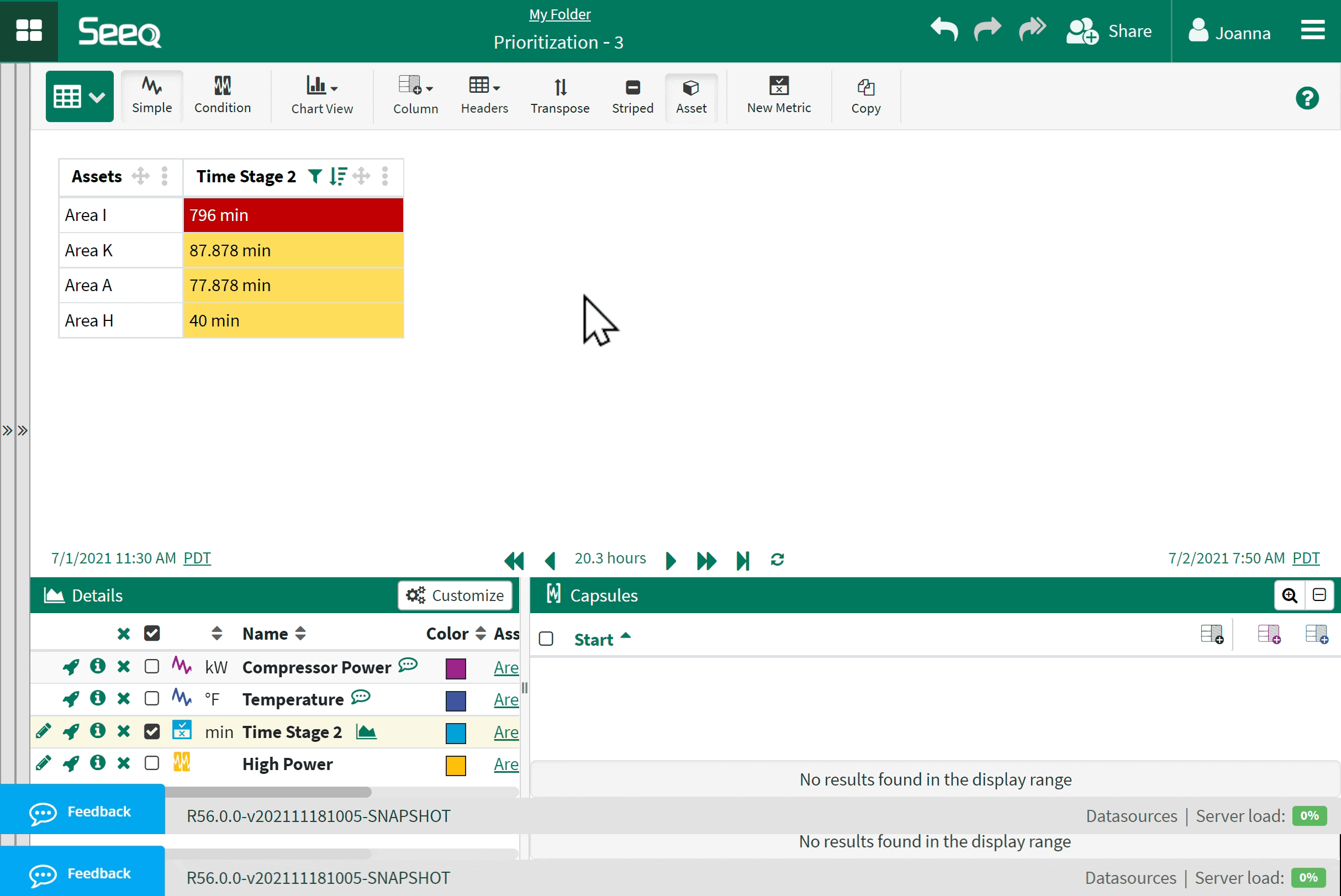 Condition tables will show any capsules that are in conditions in the details pane and Condition or Continuous metrics. Where the same condition is used, duplicate rows will be removed.