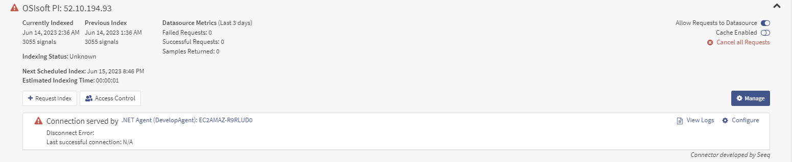 ![]() | The connection is pending. This will occur when a datasource is added from the administration panel and Seeq is waiting for a response from the agent. This will resolve within 30 seconds after the connection is added. |