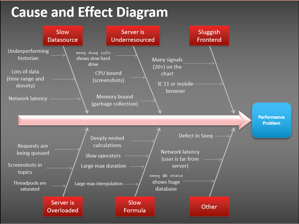 The diagram shows that there are many possible causes to performance, but many performance problems fall into the following three buckets: