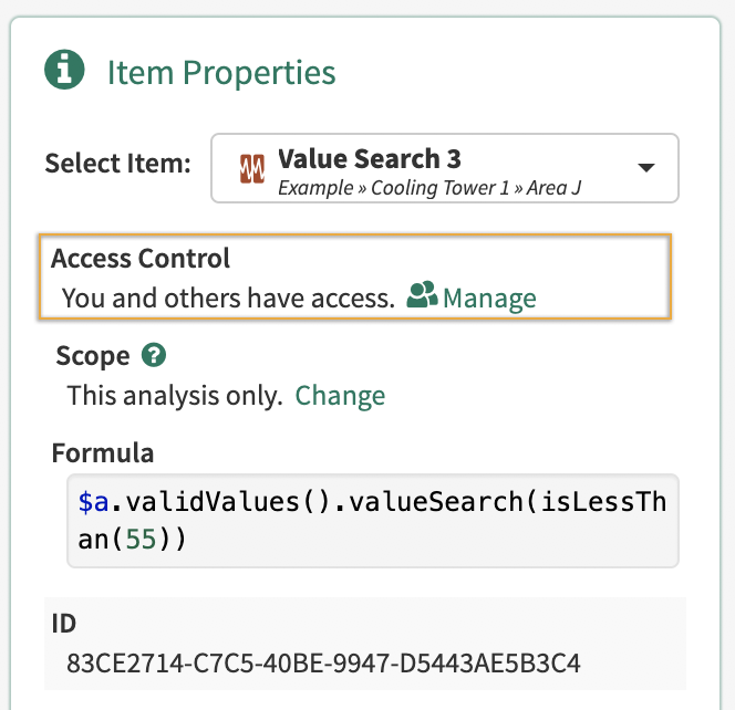 Scope and permissions may be viewed or configured on Items used within an Analysis (such as a Signal or Condition) through the Item Properties panel.