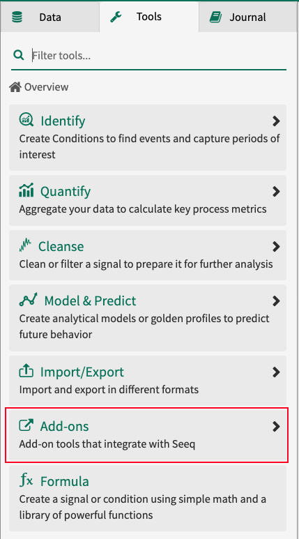 As a new Tool in Workbench under Tools >> Add-ons. These Add-ons can either launch a pop-up for users to interact with or launch a Tool in the Tool Pane that does not ship with Seeq but is defined by the Add-on installed. This is a widely-used type of Add-on as some Data Lab users can take an example and modify it to achieve their specific purpose.