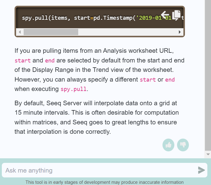 After clicking on one of the agents the user can type out a question in the dialog box at the bottom of the chat panel and send for a response from the AI Assistant in Seeq Data Lab. The response is streamed to the user and any code mentioned in the answer is displayed in a code box with a copy button on the right corner of the code box and also an arrow icon that will inject that code box into a new cell below the current active cell in your analysis notebook where it can be run straight away. The assistant has memory of the entire conversation and uses this memory as context for subsequent questions within the conversation.