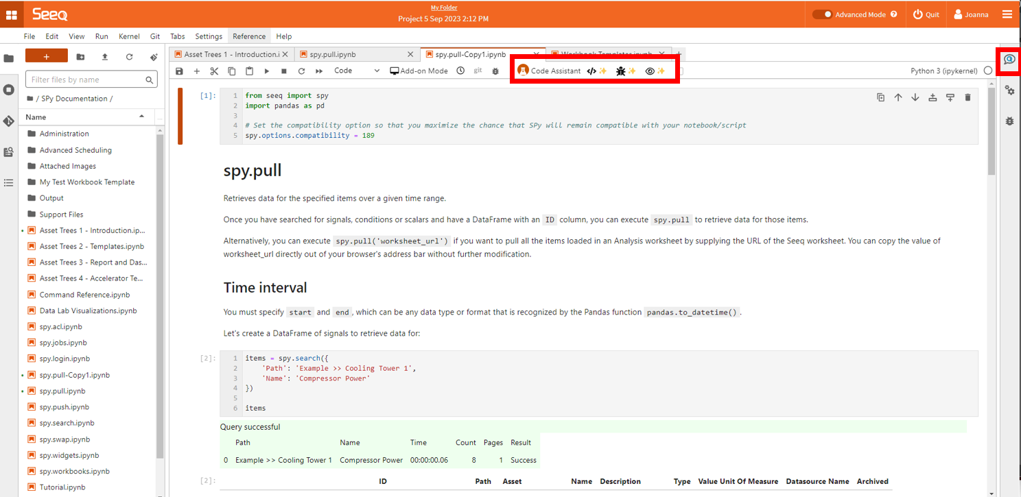 The AI Assistant in Seeq Data Lab is a tool that leverages LLMs (Large Language Models) to perform tasks such as generate code, help debug, review and assist with your Python code directly in the cells of your notebook, this functionality can be accessed via the toolbar buttons (see buttons enclosed in red rectangles) or through a chat panel on the right.