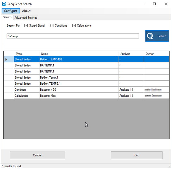 Once the connection details have been configured, the Seeq data for the attribute can be selected from the "Seeq Series Search" dialog. The search dialog box works in the same manner as the Seeq data search in the Seeq application. By default, all series and conditions containing the search string are listed. Wildcards and regular expressions are also supported.