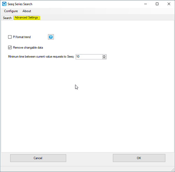 The main configuration dialog box is shown below. It is displayed when a user clicks the "Settings..." button after the "Seeq" Data Reference has been selected in PI System Explorer.