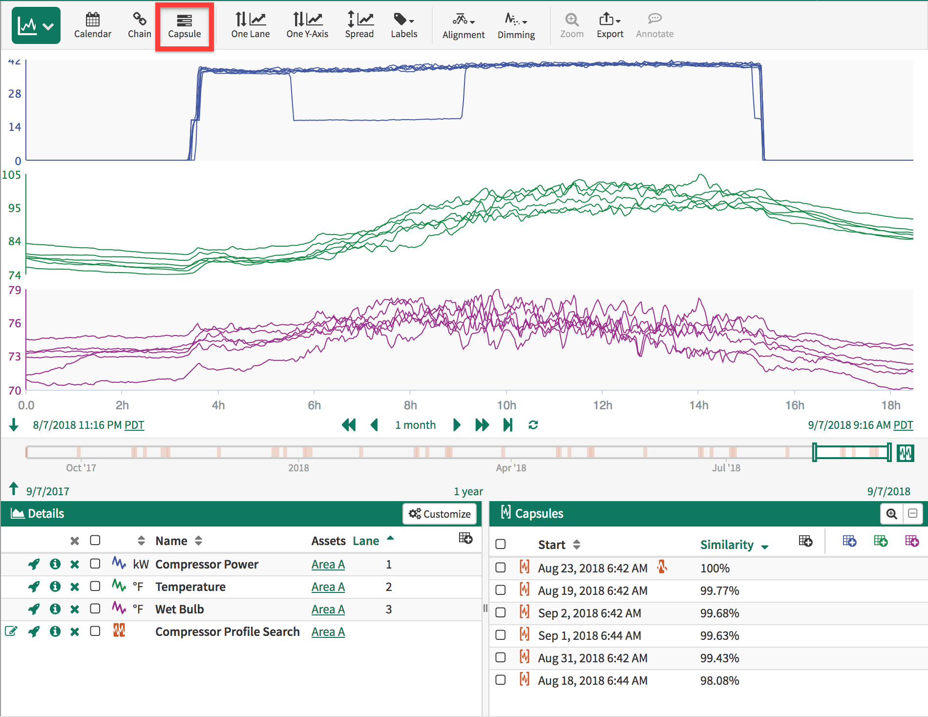 Capsule View overlays the capsules within your conditions so that you can compare one or more signals when the conditions are present. In this mode, all time shown on the X-axis is relative to the start of a capsule. This view requires that one or more conditions and one or more signals to be present in the Details pane. To enter capsule view, click the Capsule icon