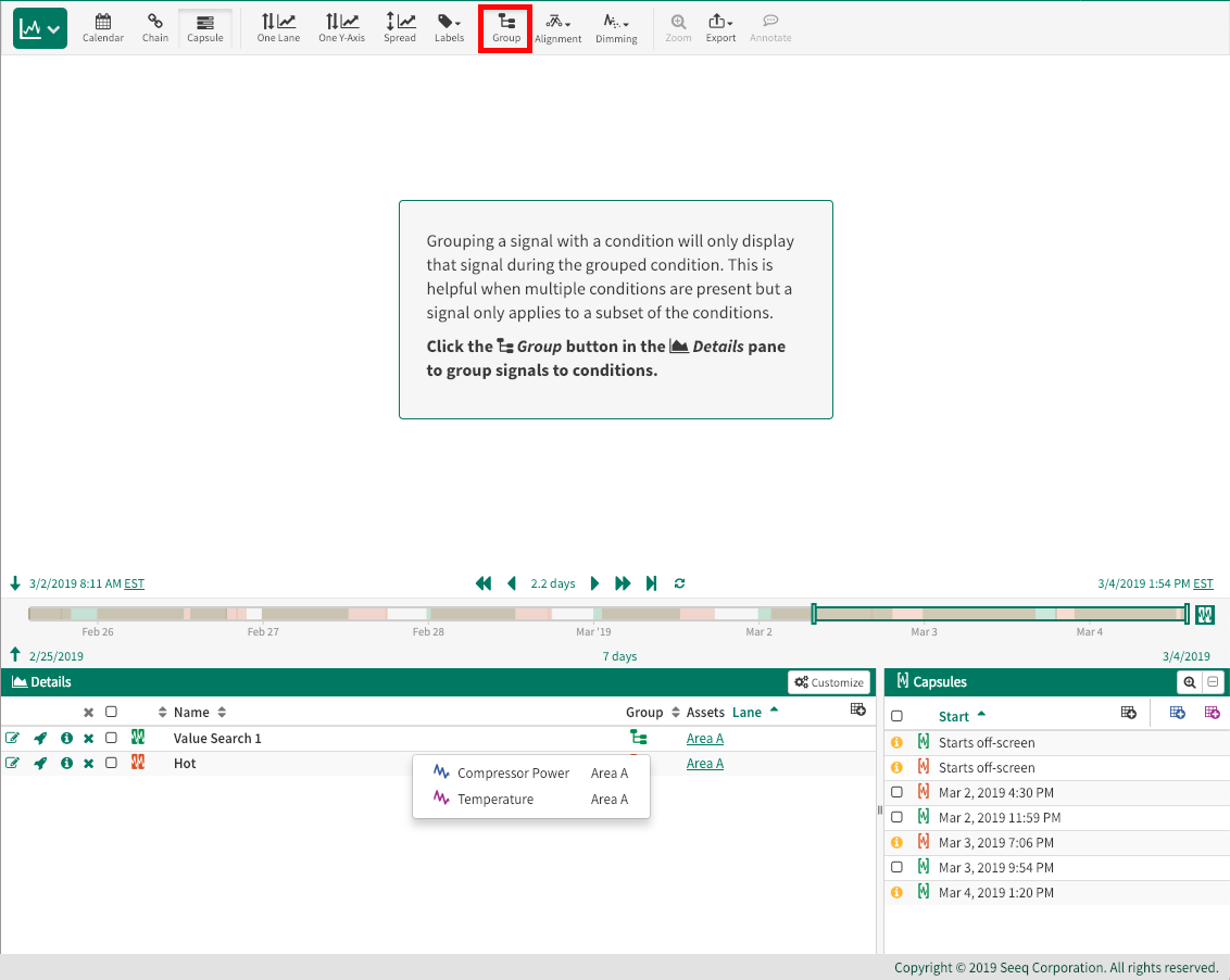 When the toolbar Group button is enabled, then any condition in the details pane that has no grouped signals will be automatically grouped with signals in the details pane that share the same parent asset. Additionally, any new signals or conditions that are added to the details pane will be automatically grouped if they share the same parent asset.