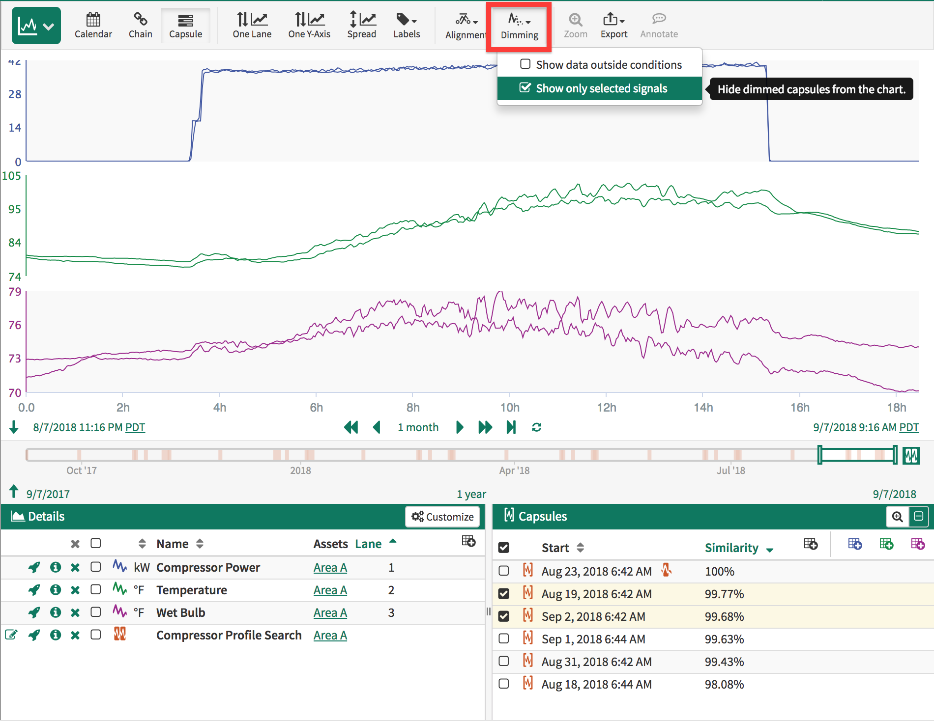 If you want to be able to remove the dimmed capsules to remove clutter from your trend you can do so by selecting the Show only selected signals option from the Dimming Menu.