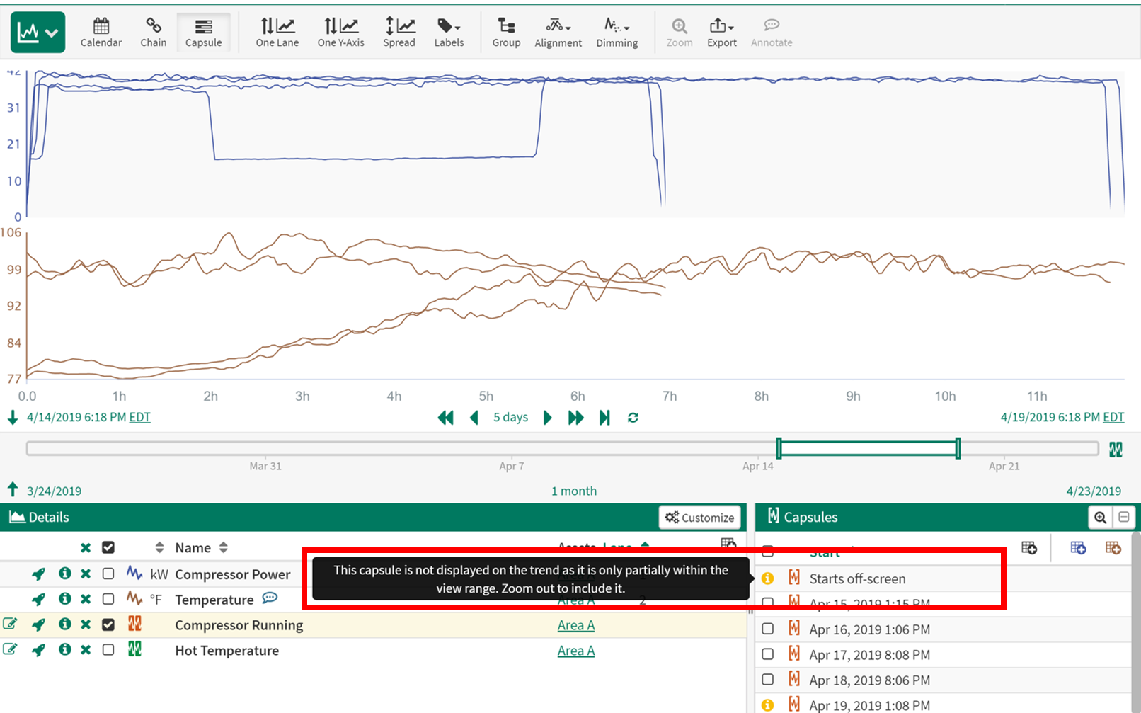 All of the capsules are visible on the trend by default. You can use the checkboxes next to each capsule in the Capsules Pane to highlight certain capsules. The capsules pertaining to the checked boxes will appear on the trend normally. The capsules pertaining to the unchecked boxes will appear "dimmed" on the trend.