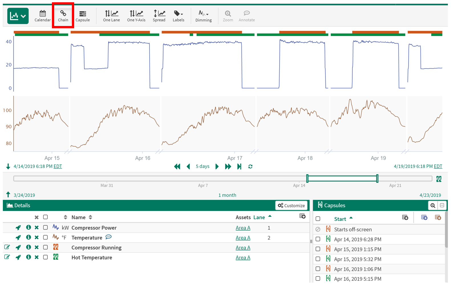 Chain view filters the trend to only display signal periods during conditions of interest. This view requires that one or more conditions and one or more signals to be present in the details pane. To enter into chain view click the Chain icon