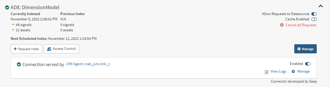 The format is Seeq Property Name : Column Name. The column name MUST be included in the columns property of the MetadataQuery section. This allows the value in the column from ADX to be stored in the property of the Signal in Seeq. These can be dynamic properties as well that act as additional information you would like to include with the signal, such as machine type, sensor type, lineage information, or other tracking information. In the example shown to the right, this is one of the signals that was indexed from the DimensionTable above. It contains information such as the Database Name, Table Name, Value Column, Time Column, Filters used, the unit of measure, and the Interpolation Method. Some of these are automatically created by the connector: