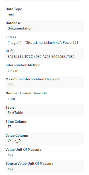 Site 1 | MachineA | Line 1 | Power | Site 1.Line 1.MachineA.Power123 | ft/s | linear | numeric |