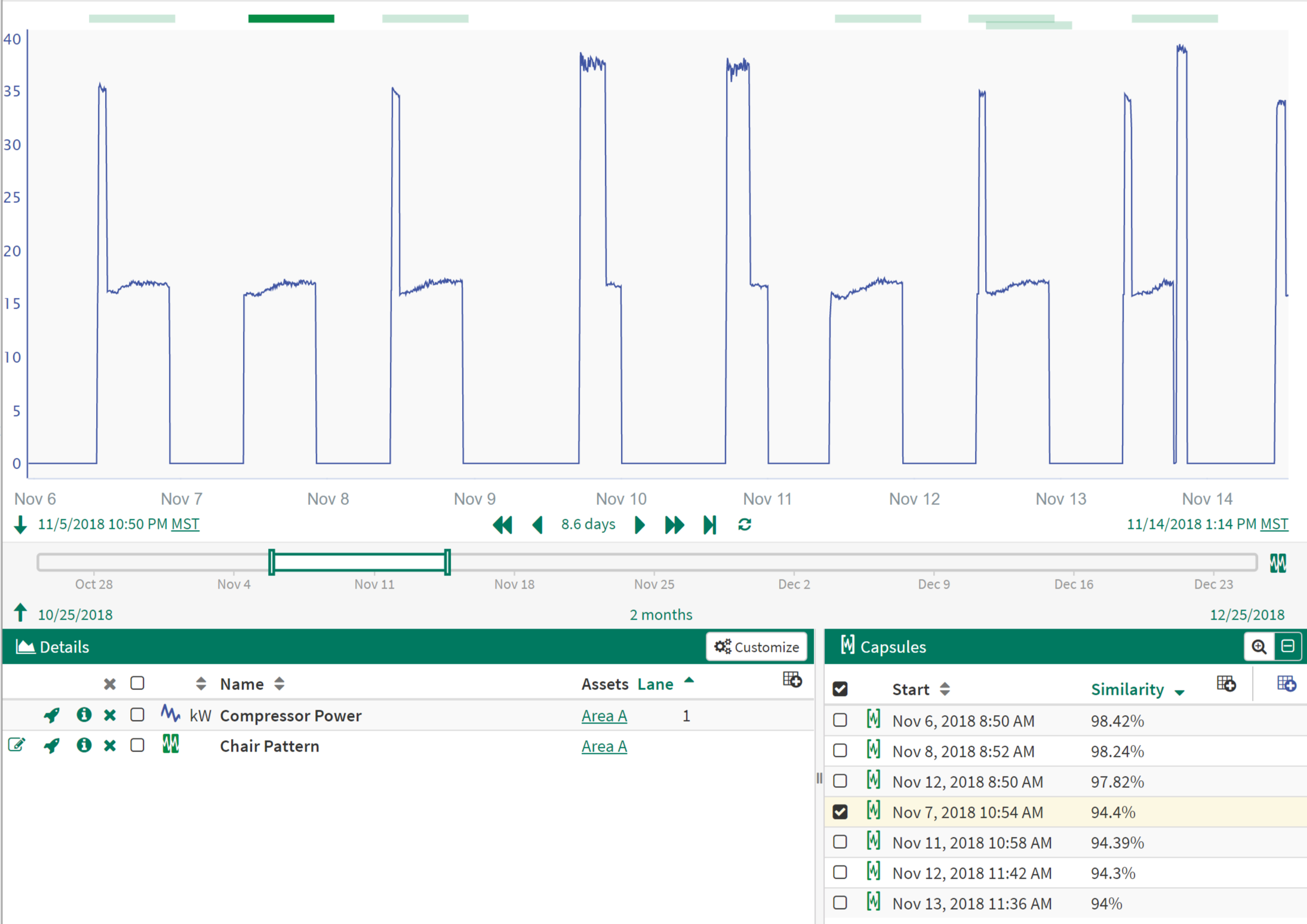 Profile Searches enable you to highlight a signal pattern on the trend and find other occurrences of that pattern on the same signal. A condition is created with a capsule for every time a pattern occurs that meets your search criteria. You can then use the condition to view other signals during the same time the pattern or profile occurs, perform calculations or any other condition operation inside Seeq.