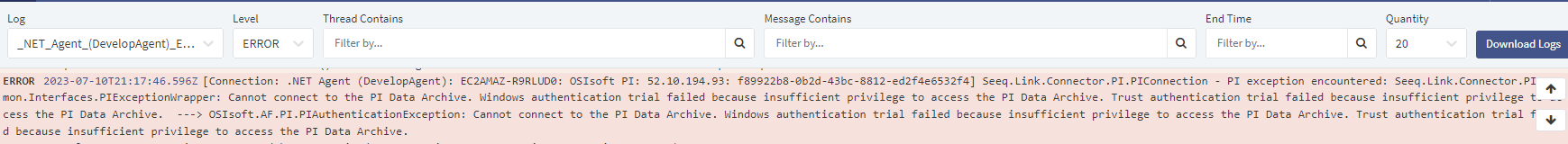 Since all source historians and databases have varying interfaces and error messages, the most useful source of troubleshooting information is the Seeq connectors' log. Clicking View Logs will open a new tab displaying the agent log, filtered only to show messages from the datasource connection.