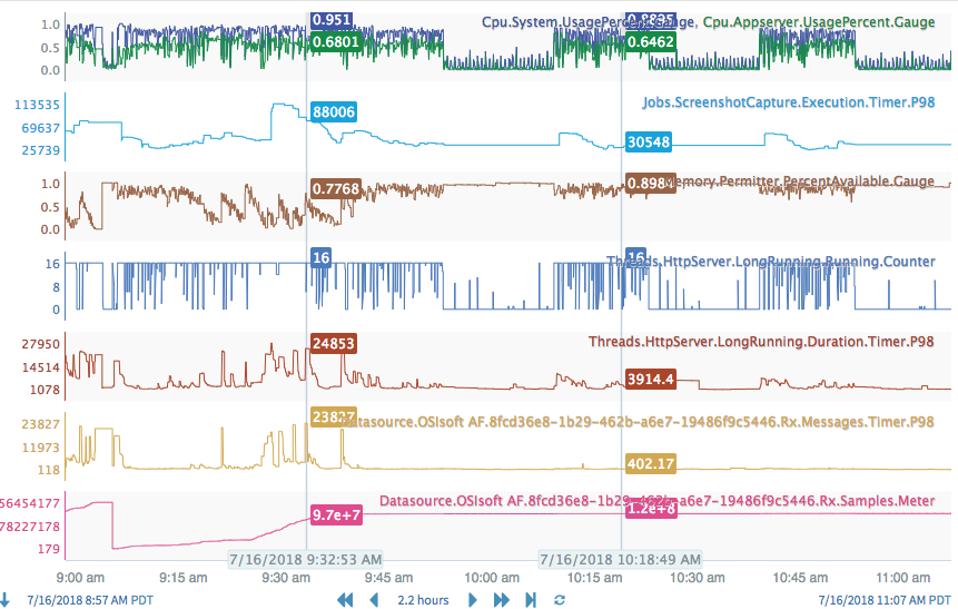 LongRunning/Running.Counter and LongRunning/Queued.Counter - Can help diagnose if running formulas are backing up the system. If the Queued counter is above zero then the system is having to place requests on hold while others finish.