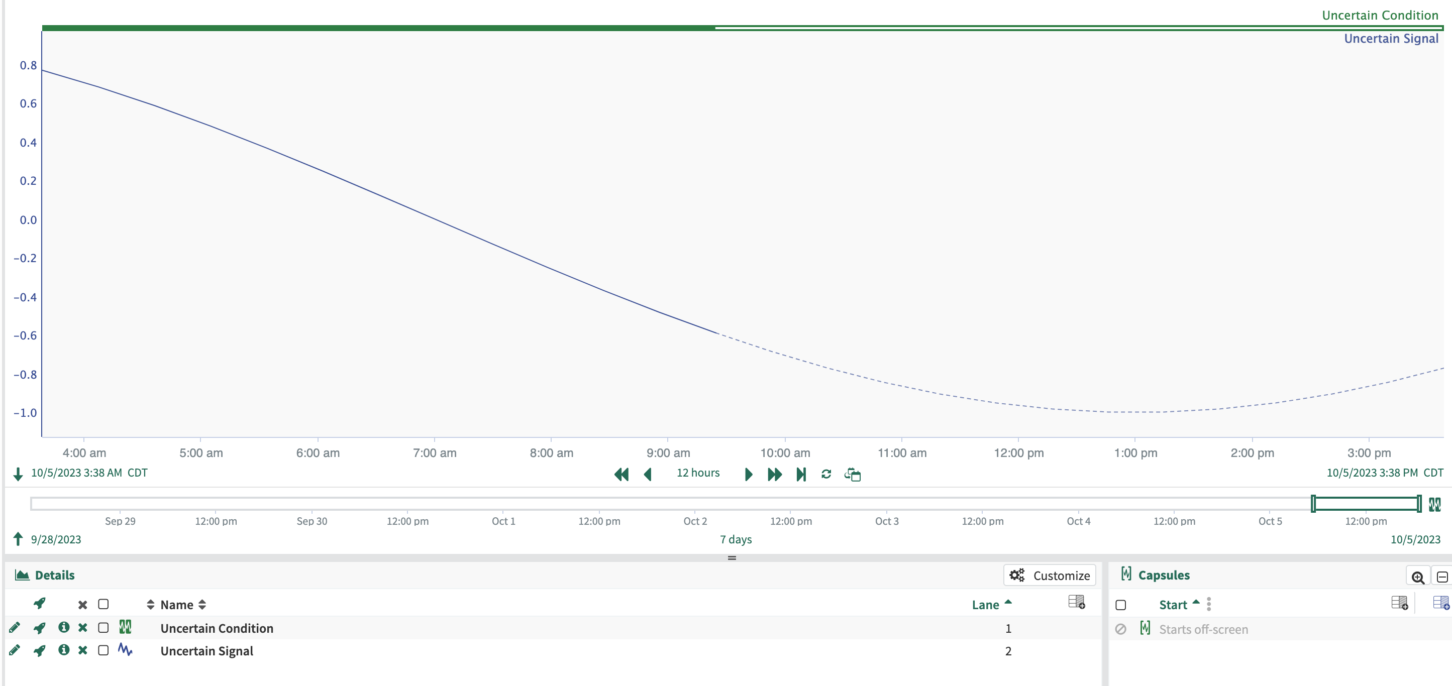 Uncertainty describes a point in time past which the values of a signal or condition might change. Generally this is a point close to the present time. This appears on the trend as dashed lines for signals and hollowed-out capsules for conditions.