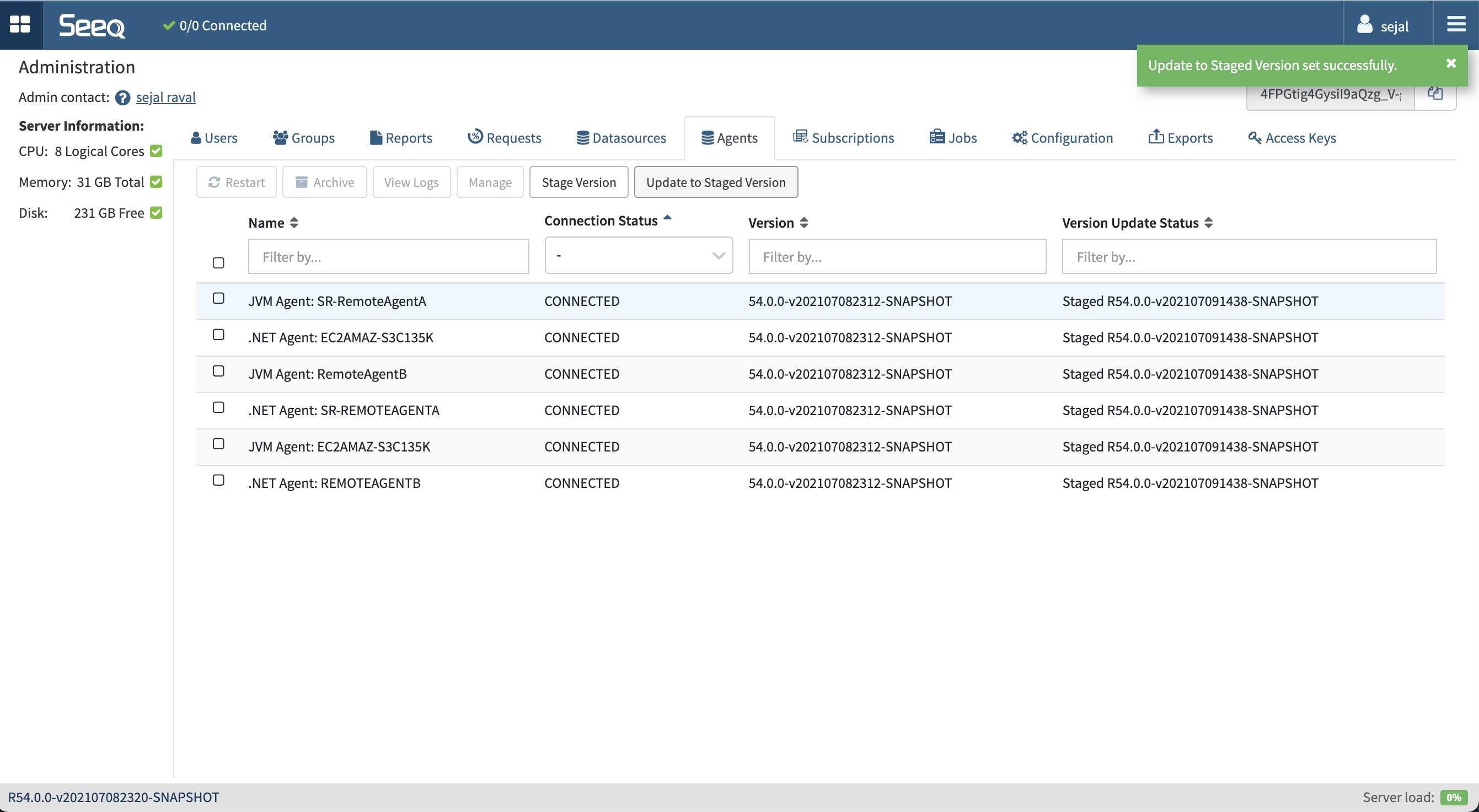Agents receive this directive in 15 minutes of being set and switch the current version to the staged version. Seeq restarts on the agent, so the ‘Connection Status’ on UI displays Disconnected briefly.