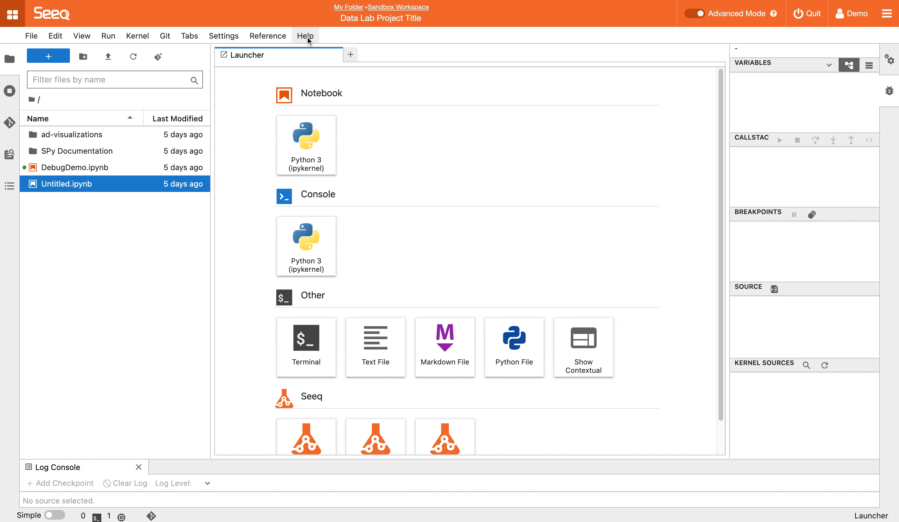 The Data Lab interface has a header designed to give you the same look and feel as Workbench and Organizer. It has home navigation, Project path, editable Name, and the hamburger menu. The header also has a Notebook Mode toggle button. While the default view for a project is Advanced Mode which is the JupyterLab interface, switching to Notebook Mode will bring you into the classic Jupyter Notebook environment with some custom Seeq additions.