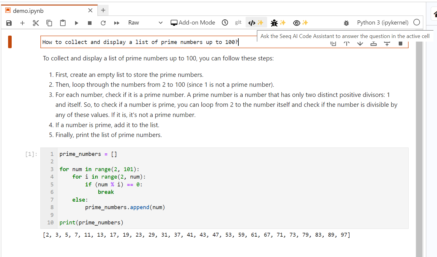 The first button is to âAsk the Seeq AI Code Assistant to answer the question in the active cellâ and is displayed as a â</>â¨â. The intention for this function is so that users can quickly ask a question of the assistant to complete or provide some code in the cells below to assist with their analysis. It can be used as a starting point when the user knows what analysis they wish to perform but doesn't know exactly how to start or the right python code to achieve their idea. In addition it can be used throughout your existing analysis to improve current workflows or assist users get past technical roadblocks.