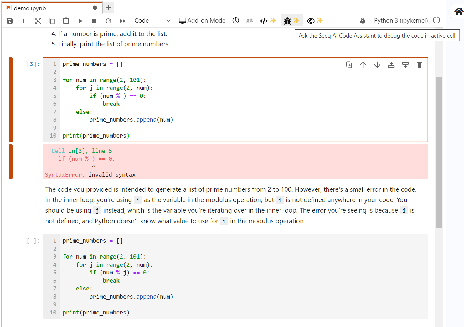 In the figure below we showcase a very simple example to illustrate the workflow, the assistant receives your code in the active cell and its error stack trace. The assistant starts by streaming a detailed explanation of both the error it sees and a solution to the problem in a markdown cell below your active cell. After this explanation it then generates a code cell with the suggested fixed python code which can be directly run in your notebook to validate the code is now working.