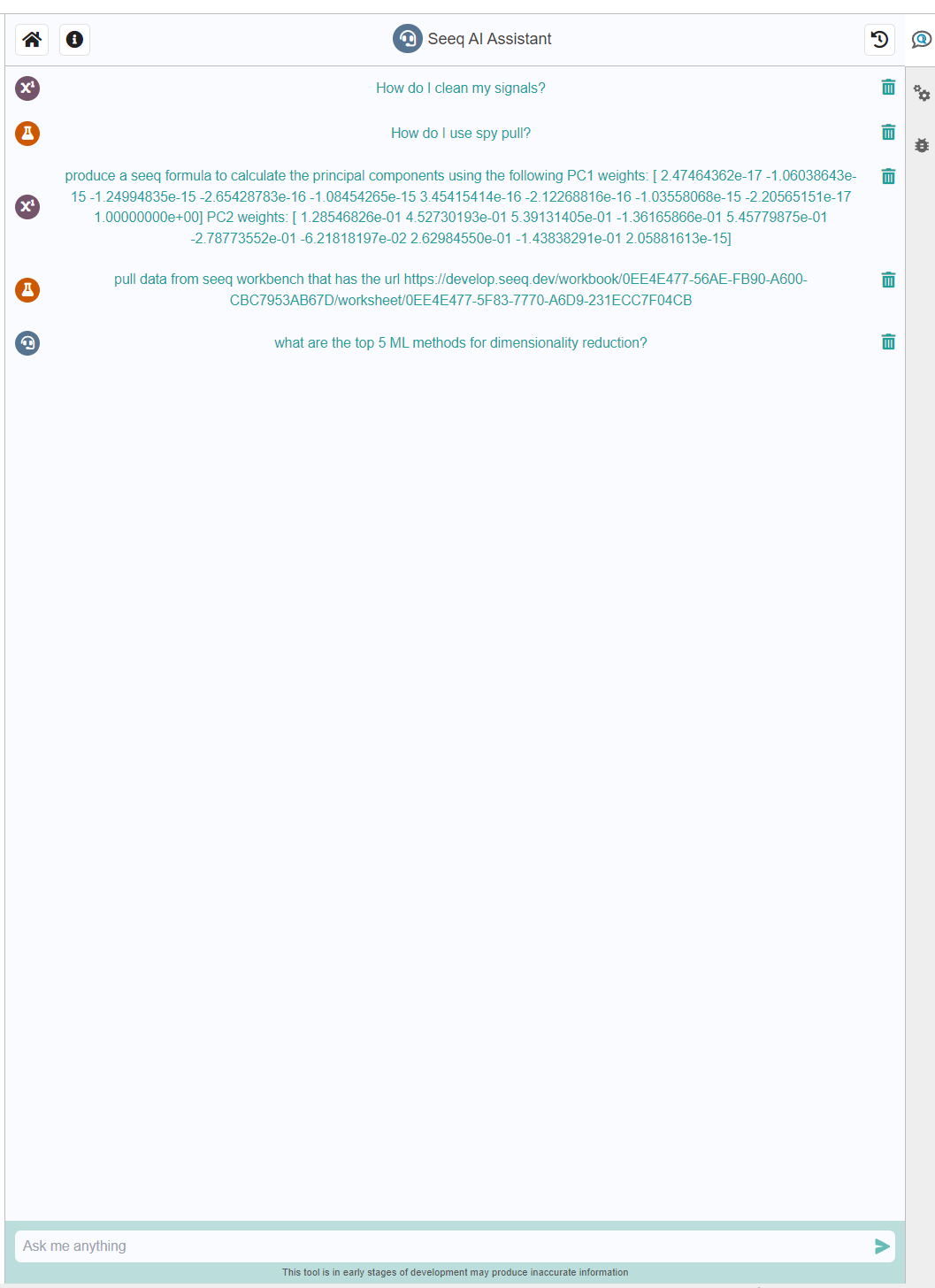In the top right of the chat panel is the history icon that allows the user to retrieve a previous conversation and pick off where the user left off. The icon of the type of agent used in that conversation is displayed along with the first question from the user. This history is stored in the Data Lab instance and never shared outside a customer's Seeq instance. Each userâs history can only be seen by that user, connected via their Seeq account. The user can delete each conversation via the trash bin icon to the right of each conversation history.