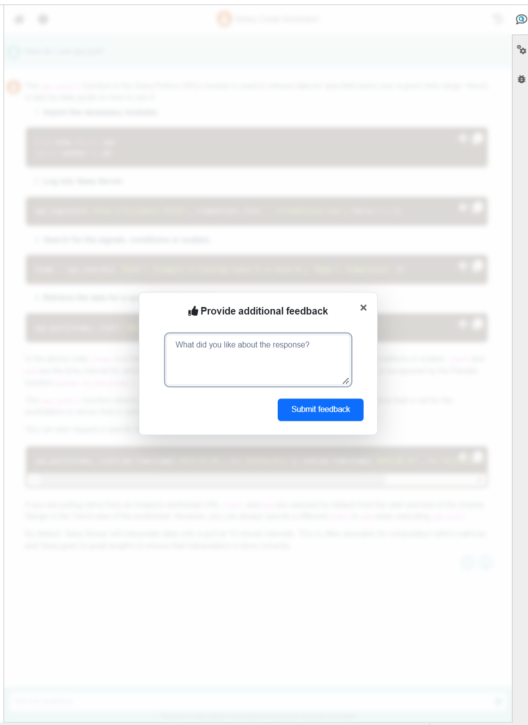 At the end of each response is a thumbs up and down icon, this allows the user to provide feedback to the AI Assistants if the response is good or bad with an optional feedback text box to provide more detail.