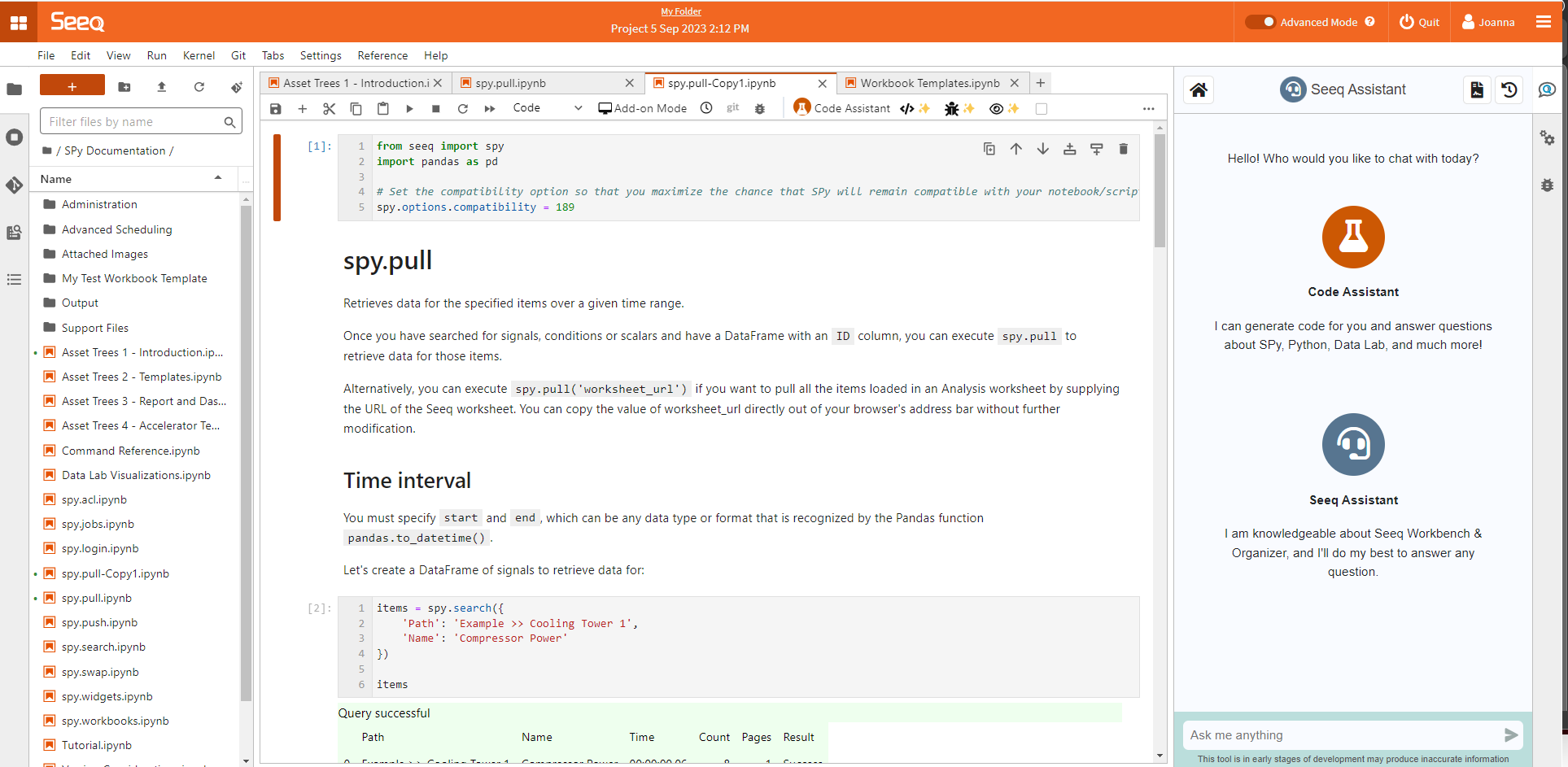 After clicking on one of the agents the user can type out a question in the dialog box at the bottom of the chat panel and send for a response from the AI Assistant in Seeq Data Lab. The response is streamed to the user and any code mentioned in the answer is displayed in a code box with a copy button on the right corner of the code box and also an arrow icon that will inject that code box into a new cell below the current active cell in your analysis notebook where it can be run straight away. The assistant has memory of the entire conversation and uses this memory as context for subsequent questions within the conversation.