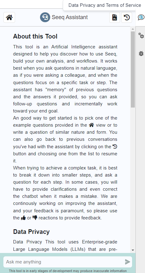 The Seeq AI Assistants used in this tool do NOT use any customer or user data available in other parts of Seeq - it utilizes only the input (prompt) you provide, the previous inputs and outputs within the current conversation (if any), and various sources of Seeq documentation relevant to providing an answer.