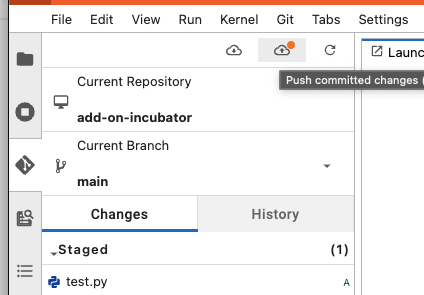 To Push committed changes to the GitHub repository, click the cloud icon with arrow pointing up (:cloud-upload:) just below the toolbar.