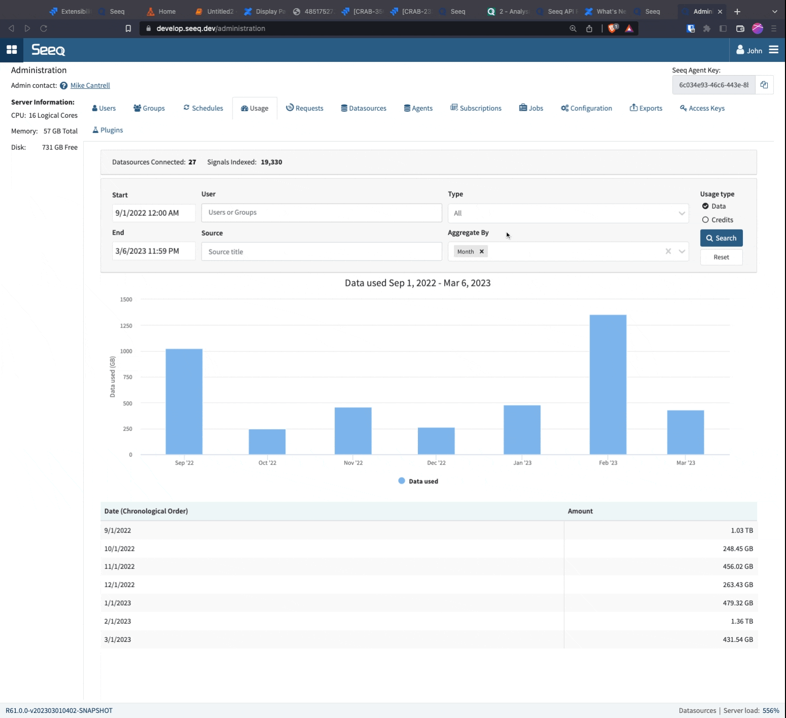 Navigate to the Usage tab on the Administration page. The default view is monthly over the last 6 months, but different start and end dates can be entered. Click into the Monthly or Daily columns on the chart to see more detail. Apply various filters or change the dates to further narrow how you view the data. Scrolling down from the charts will reveal a table displaying the data. The image below shows adding Type as an aggregation: