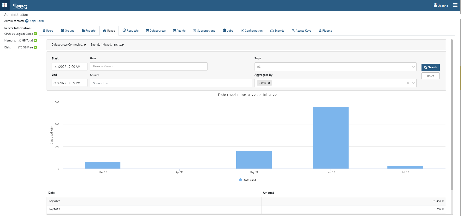 Many administrators are interested in how Seeq is used within their organizations. See how much data is flowing through Seeq and gain insight on which users and sources are driving this traffic by exploring the Usage tab.